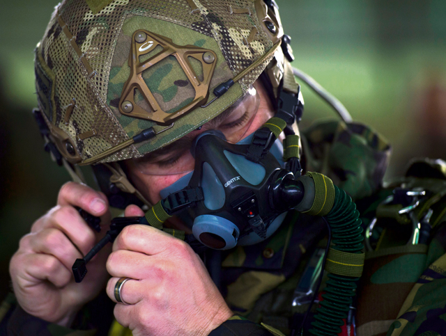 Sgt. Carlos Basilio, Portuguese paratrooper, adjusts his oxygen mask in preparation for a free-fall jump during exercise Real Thaw 16 Feb. 24 in Beja, Portugal. The paratroopers jumped from approximately 18,000 feet to test their high-altitude, free-fall capabilities.