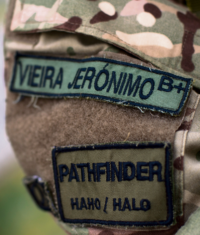Patches of a Portuguese paratrooper are worn as he prepares for a high-altitude, low-opening jump during exercise Real Thaw 16 Feb. 24 in Beja, Portugal.