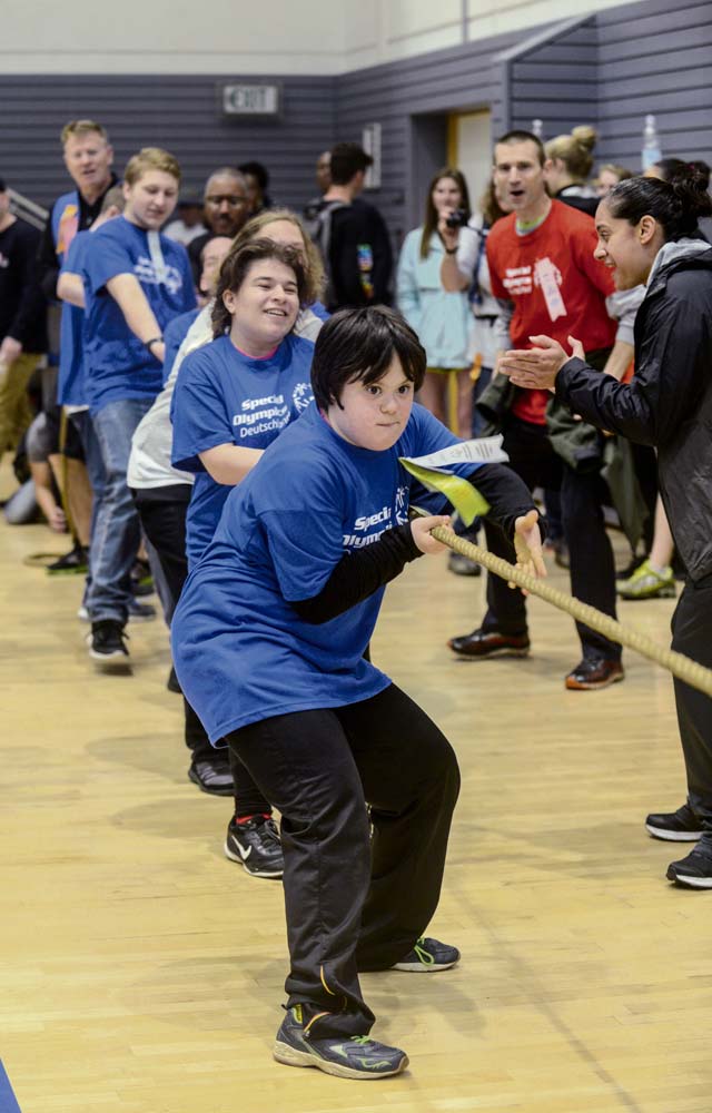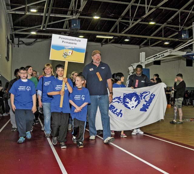 “The committee does a good job of separating the schools so that they can meet other kids, but many of them are here on Ramstein for the first time,” Garrett said. “My (athlete) had never been at a Special Olympics, and his parents did not know what to expect either. I was their guide on where to go, how loud to cheer, and just an extra person for encouragement for their child. Sometimes someone yelling and cheering them on for something as simple as a hula hoop makes them the happiest person on the planet; this is where I think it makes the biggest difference.”