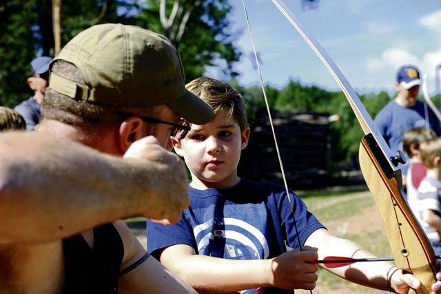 Dominic, son of Tech. Sgt. Thomas Gentry, 603rd Air Operations Center air and air defense noncommissioned officer in charge, listens as Marc Galbraith, 786th Force Support Squadron archery course instructor, demonstrates pulling back the arrow during an Introduction to Archery course at the Kaiserslautern Rod & Gun Club July 29 on Vogelweh Military Complex.