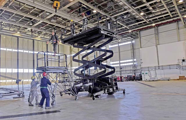 Airmen assigned to the 721st Aircraft Maintenance Squadron participate in fall protection training May 10 on Ramstein. The training was conducted as part of the Occupational Safety and Health Administration’s National Fall Prevention Stand-Down, which encourages employers to train their employees on fall hazards and the importance of fall protection. — Photo by Senior Airman Tryphena Mayhugh