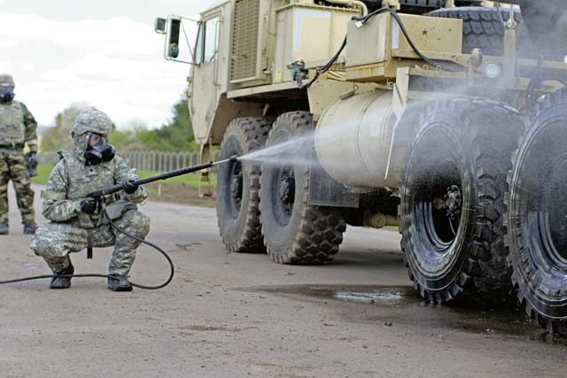 A Soldier decontaminates a Patriot Launcher in mission-oriented protective posture 4 to simulate a real-life scenario during chemical, biological, radiological and nuclear training for Soldiers from the 10th Army Air and Missile Defense Command on Baumholder Army Airfield.
