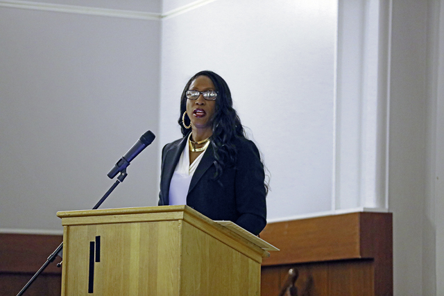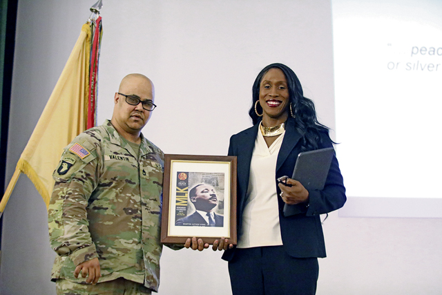 U.S. Army Capt. Chaplain Tammy Briggs receives a token of appreciation for being the guest speaker during the MLK ceremony.