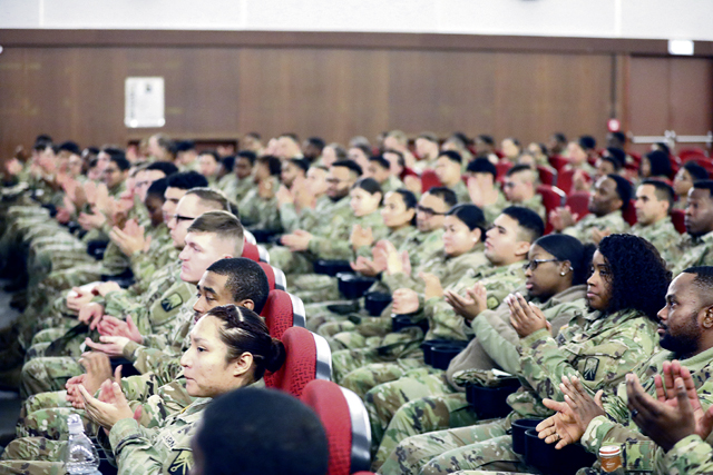 16th Sustainment Brigade soldiers clap after the speech given by the guest speaker U.S. Army Capt. Chaplain Tammy Briggs during the MLK ceremony.