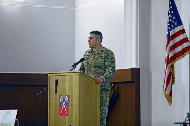 U.S. Army Maj. David Derienzo, 16th Sustainment Brigade, Brigade Chaplain, gives the Invocation during the MLK ceremony.