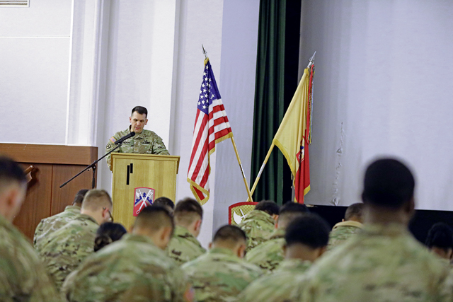 U.S. Army Col. Matthew Alexander, commander, 16th Sustainment Brigade, introduces the guest speaker U.S. Army Capt. Chaplain Tammy Briggs.