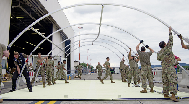 U.S. Airmen assigned to Ramstein Air Base, Germany help set up tents at Ramstein Air Base, Germany, Aug. 19, 2021. Ramstein Air Base is providing safe, temporary lodging for qualified evacuees from Afghanistan as part of Operation Allies Refuge during the next several weeks. Operation Allies Refuge is facilitating the quick, safe evacuation of U.S. citizens, Special Immigrant Visa applicants and other at-risk Afghans from Afghanistan. Qualified evacuees will receive support, such as temporary lodging, food, medical screening and treatment and more, while housed at Ramstein Air Base while preparing for onward movements to their final destinations. (U.S. Air Force photo by Airman Edgar Grimaldo)