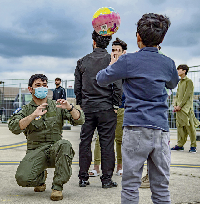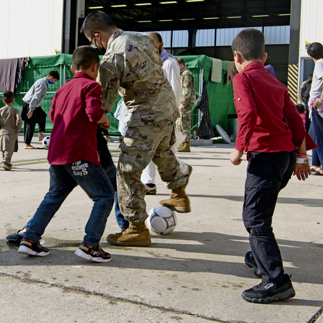 Senior Airman Andrew Stutesman, 603rd Air Communications Squadron cyber system technician, plays soccer with evacuees at Ramstein Air Base, Germany, Aug. 23, 2021. U.S. Airmen work non-stop delivering clothing, toys and water to evacuees daily. Ramstein, a transit location for evacuees from Afghanistan, is providing temporary lodging, food, medical services and treatment while they await transportation to more permanent resettlement locations. Ramstein Air Base transformed into U.S. European Command’s primary evacuation hub supporting one of the largest, most complex humanitarian airlift operations in history. (U.S. Air Force photo by Airman Edgar Grimaldo)