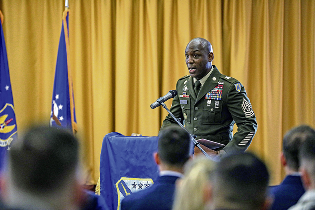 Command Sgt. Maj. Kofie Primus, senior enlisted advisor, 21st Theater Sustainment Command, gives a speech as the guest speaker during the U.S. Air Force Kisling Noncommissioned Academy graduation, Feb. 13, on Vogelweh Air Base. The Kisling NCOA is the only Air Force leadership academy in the entire European Theater.