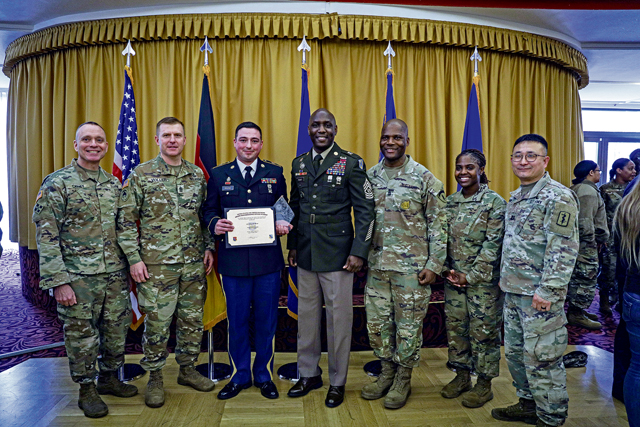 Staff Sgt. Alexander Bruno (third from the left), religious affairs non-commissioned officer, 519th Hospital Center, poses for a photo with his leadership after making the commandant’s list during the U.S. Air Force Kisling NCO Academy graduation, Feb. 13, on Vogelweh Air Base. Bruno is not the first 21st Theater Sustainment Command Soldier to attend the Kisling NCOA, but he is the first to make the commandant’s list.