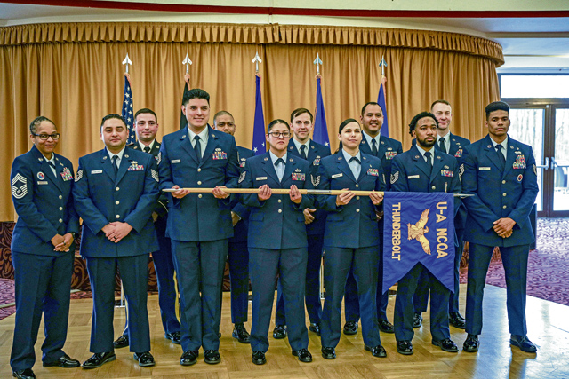 Staff Sgt. Alexander Bruno (third from the left), religious affairs non-commissioned officer, 519th Hospital Center, poses for a photo with his “thunderbolt flight” teammates during the U.S. Air Force Kisling NCO Academy graduation, Feb. 13, on Vogelweh Air Base. Bruno was the only U.S. Army Soldier in the course that is the U.S. Air Force’s equivalent of the U.S. Army’s Senior Leader Course.