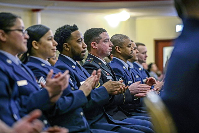 Staff Sgt. Alexander Bruno (middle), religious affairs non-commissioned officer, 519th Hospital Center, claps after a speech during the U.S. Air Force Kisling NCO Academy graduation, Feb. 13, on Vogelweh Air Base. Bruno was the only U.S. Army Soldier in the course with U.S. Air Force and Space Force technical sergeants.