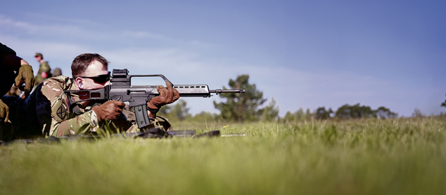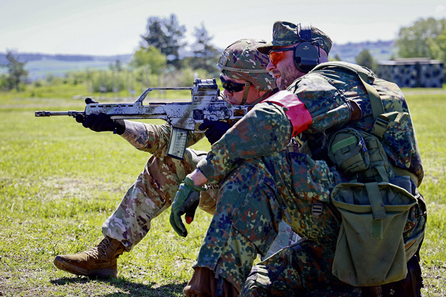 U.S. Army Capt. Christopher Jorgensen, force health protection officer, 21st Theater Sustainment Command, fires an H&K G36 service rifle during a drill for the Schützenschnur, or German Armed Forces Badge, for a marksmanship event in Ohrdruf, May 15.