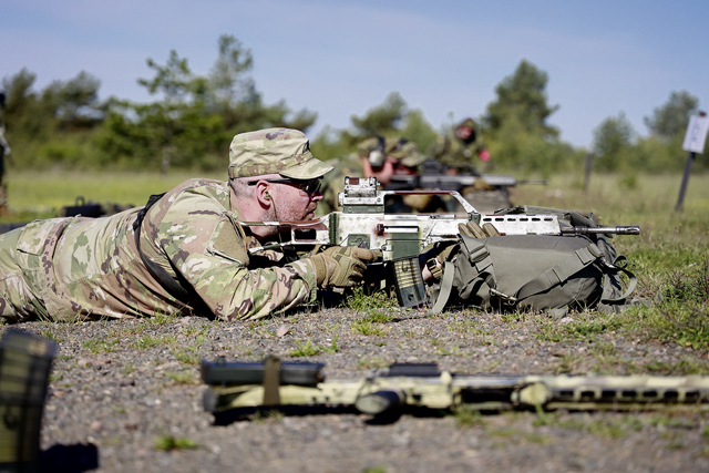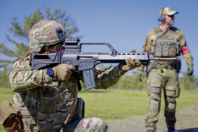 U.S. Army Sgt. Marcos De La Villa, human resources specialist, 21st Theater Sustainment Command, fires an H&K G36 service rifle during a drill for the Schützenschnur, or German Armed Forces Badge, for marksmanship event in Ohrdruf, Germany, on May 15, 2024. The German armed forces regulations point out that “the Schützenschnur is a decoration for weapons proficiency for enlisted soldiers.” (U.S. Army photo by Spc. Samuel Signor)