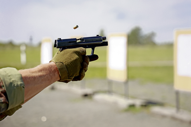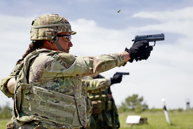 U.S. Army Sgt. Jiyah Warren, paralegal specialist, 21st Theater Sustainment Command, fires an H&K P8 A1 service pistol during a drill for the Schützenschnur, or German Armed Forces Badge, for marksmanship event in Ohrdruf, Germany, on May 15, 2024. The Schutzenschnur badge is awarded to military personnel of all grades but is only allowed to be worn by enlisted members. (U.S. Army photo by Spc. Samuel Signor)