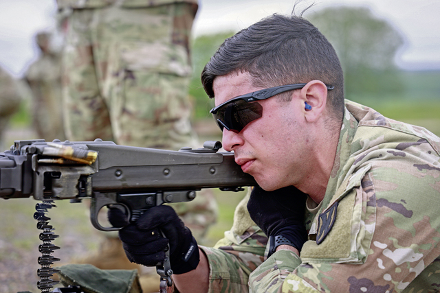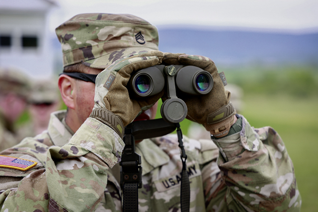 U.S. Army Staff Sgt. Jose Jimenez, deputy commander executive aide, 21st Theater Sustainment Command, uses binoculars to spot for the Soldier firing the MG3 machine gun during a drill for the Schützenschnur, or German Armed Forces Badge, for marksmanship event in Ohrdruf, Germany, on May 16, 2024. The German armed forces regulations point out that “the Schützenschnur is a decoration for weapons proficiency for enlisted soldiers.” (U.S. Army photo by Spc. Samuel Signor)