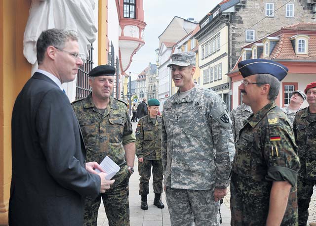 Maj. Gen. John R. O’Connor, commanding general of the 21st Theater Sustainment Command, receives a tour of a Thüringen government building during a visit with the German Bundeswehr Logistics Command Oct. 24. O’Connor traveled to Erfurt to meet with his German counterparts in order to discuss ways to strengthen and build upon the lasting partnership between the two logistical commands.