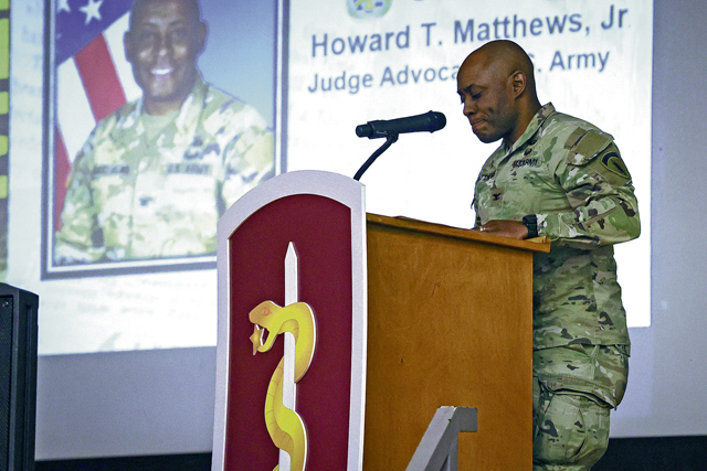 U.S. Army Col. Howard Matthews Jr., judge advocate, U.S. Army Europe and Africa, gives remarks as the guest speaker at the Martin Luther King Jr. Day observance at Tiger Theater, Sembach Kaserne, Germany, on Jan. 16, 2024. Matthews gave a detailed speech about the importance of MLK’s legacy and the impact he made. “Reverend Dr. Martin Luther King Jr. was among us earthly beings for only 39 years. However, he accomplished so much and stood for so many impactful ideas,” said Matthews. “He was a Nobel Peace Prize Laureate, a prolific author, and, of course, a leader.” Matthews spoke about his ideals and how people must consistently keep his values of change in mind if they want to make the change he envisioned for America. (U.S. Army photo by Spc. Samuel Signor)