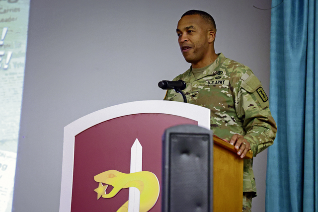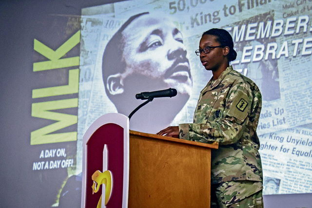 U.S. Army Capt. Mary Johnson, commander of the Headquarters and Headquarters Company, 30th Medical Brigade, gives remarks at the Martin Luther King Jr. Day observance, which was hosted by the 30th Medical Brigade at Tiger Theater, Sembach Kaserne, Germany, on Jan. 16, 2024. The theme for MLK Day remains “Remember, Celebrate, Act: A Day on Not a Day Off.” Johnson spoke about MLK’s life and achievements, emphasizing how he was a pillar of his community and preached the importance of peace and prosperity. He saw the turmoil of segregation and how he organized marches and peaceful protests to inspire those around him. (U.S. Army photo by Spc. Samuel Signor)