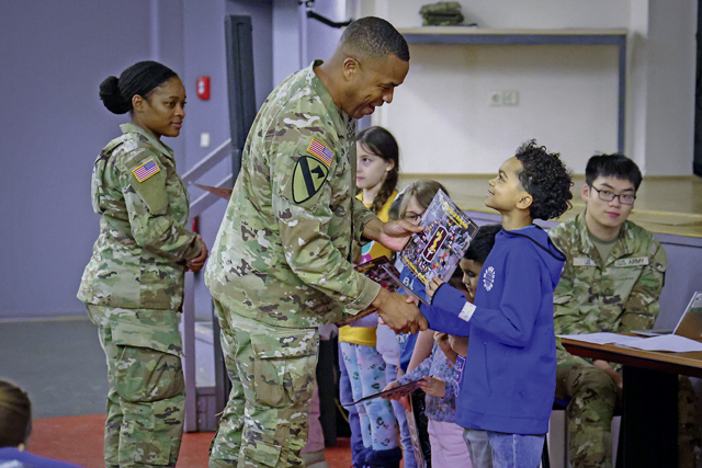 U.S. Army Col. Anthony King, commander of the 30th Medical Brigade, gives a certificate of thanks to Jaxson Main, a third-grade student, at Sembach Elementary School, along with seven other students who conducted a poem reading and performed two songs in commemoration of Martin Luther King Jr. Day at the MLK Day observance at Tiger Theater, Sembach Kaserne, Germany, on Jan. 16, 2024. King thanked Sembach Elementary School for their contributions to the observance and how important it is for the community to be intertwined together. “We get to partner with a lot of different countries, and as we just mentioned, NATO and other services, but I, as the brigade commander of 30th Medical Brigade, am more proud that we partnered with Sembach Elementary School and our relationship there,” said King. (U.S. Army photo by Spc. Samuel Signor)