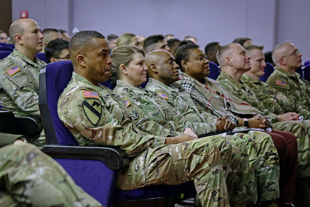 U.S. Army Col. Anthony King (left), commander of the 30th Medical Brigade, sits alongside Brig. Gen. Karen Monday-Gresham (center), commanding general of the 7th Mission Support Command and deputy commanding general of the 21st Theater Sustainment Command, and Col. Howard Matthews Jr.(right), judge advocate, U.S. Army Europe and Africa, while watching the eight students from Sembach Elementary School perform their poem reading and song performances during the Martin Luther King Jr. Day observance at Tiger Theater, Sembach Kaserne, Germany, on Jan. 16, 2024. MLK Day is held each year on the third Monday in January; the Department of Defense stands with the nation in honoring the life and enduring influence of MLK as he is celebrated as a champion of nonviolence in America and as a prominent figure in the Civil Rights Movement. (U.S. Army photo by Spc. Samuel Signor)