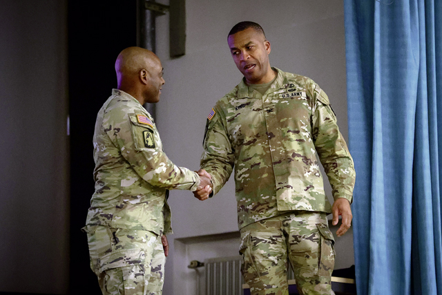 U.S. Army Col. Anthony King (right), commander of the 30th Medical Brigade, thanks Col. Howard Matthews Jr. (left), judge advocate, U.S. Army Europe and Africa, for being the guest speaker at the Martin Luther King Jr. Day observance at Tiger Theater, Sembach Kaserne, Germany, on Jan. 16, 2024. King awarded Matthews with a gift for his contributions to the ceremony and the moving speech that Matthews gave. Matthews thanked everyone for having him at the ceremony and listening to what he had to say. “We often find ourselves in a world where headlines often focus on quick wins, yet the underlying issues persist,” said Matthews. “As Dr. King observed, “it’s easy for society to rally to visible injustice such as police dogs attacking protesters, while neglecting the quieter but more insidious injustice and poverty.” (U.S. Army photo by Spc. Samuel Signor)