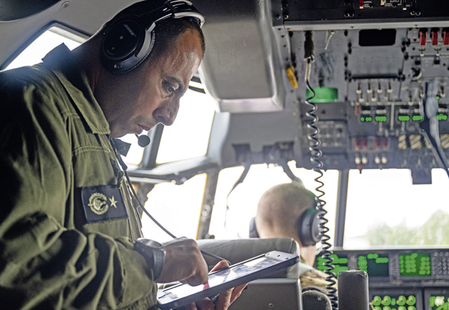 An Algerian air force pilot, assigned to the 2nd Tactical Airlift Wing, looks over a U.S. Air Force C-130J Super Hercules aircraft flight itinerary, Aug. 2, 2023. The 37th AS briefed the Algerian pilots on U.S. Air Force C-130J Super Hercules aircraft procedures, pre-flight inspections and mission planning during their time at Ramstein AB.