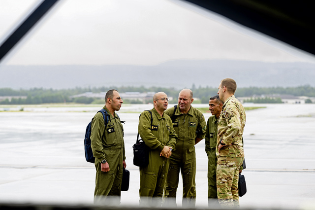 U.S. Air Force Capt. Zachary Pelky, right, 37th Airlift Squadron C-130J Super Hercules instructor pilot, speaks with Algerian air force pilots, assigned to the 2nd Tactical Airlift Wing, about C-130J pre-flight procedures at Ramstein Air Base, Aug. 2. The 37th AS hosted the Algerian pilots as part of a larger familiarization training with the 435th Contingency Response Support Squadron air advisors.