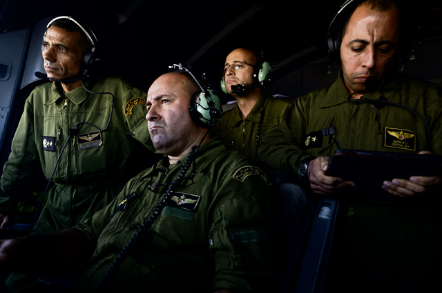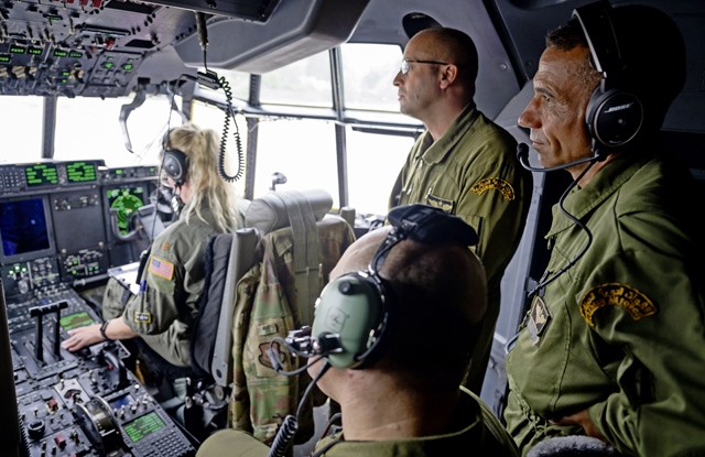 Algerian air force pilots, assigned to the 2nd Tactical Airlift Wing, sit in the cockpit of a U.S. Air Force C-130J Super Hercules aircraft while flying over Germany, Aug. 2. The 435th Contingency Response Support Squadron air advisors partnered Airmen from the 2nd TAW and 37th Airlift Squadron together for opportunities to exchange knowledge and learn about mission briefs, training processes, qualifications and evaluations of the C-130J.