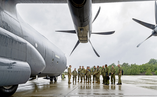 U.S. Air Force Capt. Zachary Pelky, left, 37th Airlift Squadron C-130J Super Hercules instructor pilot, instructs U.S. Air Force Airmen assigned to the 86th Aircraft Maintenance Squadron and Algerian air force pilots, assigned to the 2nd Tactical Airlift Wing, on how to conduct pre-flight inspections at Ramstein Air Base, Aug. 2. The 37th AS familiarized the Algerian pilots on mission planning, training processes, pre-flight aircraft inspections and qualifications for C-130Js during their visit.