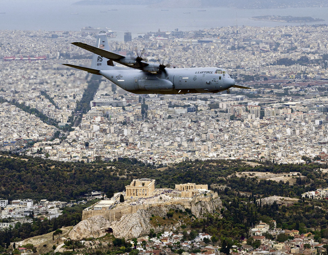 A U.S. Air Force C-130J Super Hercules cargo aircraft, from the 37th Airlift Squadron, flies over the Acropolis at Athens, Greece, May 9. The flyover was part of Stolen Cerberus X joint training exercise, which was created to enhance interoperability and airlift capabilities between U.S. and Greek Armed Forces, strengthen bilateral defense ties, and execute aeromedical evacuation and jump training. Photo by Senior Airman Andrew Bertain