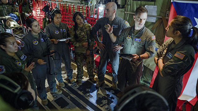 U.S. Air Force Maj. Andrew Wilson, 37th Airlift Wing C-130J Super Hercules aircraft commander, briefs the mission plan for the all-Hispanic aeromedical flight at Ramstein Air Base, Sep. 6. Loadmasters, pilots, maintainers and medical personnel took part in an aeromedical evacuation training, which also highlighted National Hispanic Heritage Month.