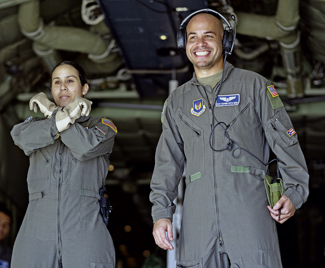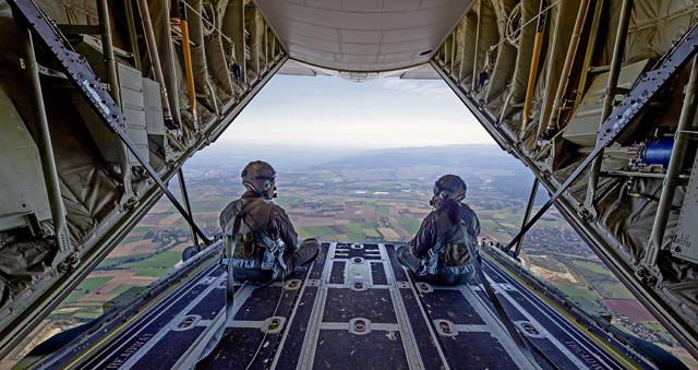 U.S. Air Force Staff Sgt. Andrew Flint, left, and Airman 1st Class Andrea Medranda, 37th Airlift Squadron loadmasters, sit on a C-130J Super Hercules ramp during a simulated cargo drop during a Hispanic heritage flight over Germany, Sep. 6. In celebration of National Hispanic Heritage Month During the flight, an all-Hispanic crew including the loadmasters, pilots, maintainers and medical personnel participated in an aeromedical flight training sortie, providing real-world aeromedical evacuation practice.