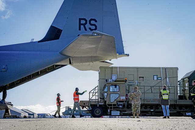 U.S. joint service members work alongside Lithuanian military members to unload cargo from a C-130J Super Hercules assigned to Ramstein Air Base, in Lithuania, Feb. 27. The 86th Airlift Wing’s C-130Js are currently enabling the movement of equipment and personnel throughout Eastern Europe.