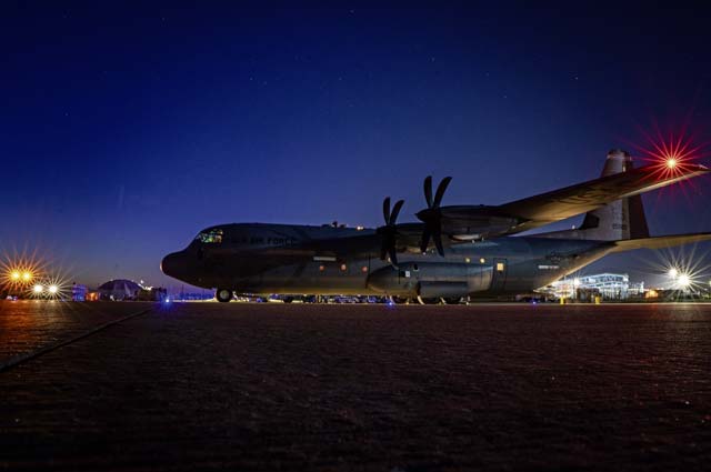 A C-130J Super Hercules assigned to the 37th Airlift Squadron at Ramstein Air Base, parks at a ramp in RAF Lakenheath, UK, Feb. 26. Ramstein AB is also providing a forward location for other cargo and air refueling platforms that are supporting contingency operations in Eastern Europe.