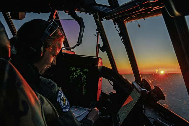 U.S Air Force Captain Shannon Hunter, 37th Airlift Squadron section chief, helps pilot a C-130J Super Hercules assigned to Ramstein Air Base over the UK, Feb. 27. Ramstein AB alongside other USAF installations throughout Europe are positioned to support a variety of NATO missions and contingency operations in Eastern Europe.