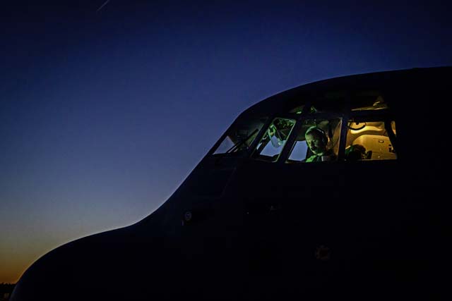 A pilot assigned to the 37th Airlift Squadron conducts pre-flight checks before take-off at Lakenheath Air Base, UK, Feb. 27. The 86th Airlift Wing’s C-130J movement of cargo and personnel aims to support NATO Allied missions in Eastern Europe.
