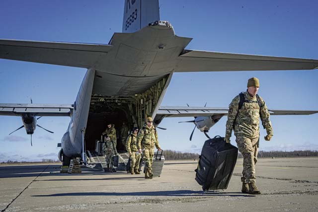U.S. Air Force Airmen assigned to RAF Lakenheath exit a Ramstein Air Base C-130J Super Hercules in Lithuania, Feb. 27. The 86 AW, headquartered at Ramstein Air Base is one of many USAF units providing support to U.S. NATO allies and partners in Eastern Europe.