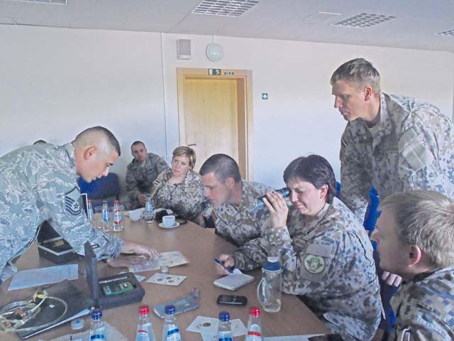 Master Sgt. Albert Black, 435th Contingency Response Group air adviser, instructs a Latvian fuels team on a fuels system icing inhibitor at Lielvarde Air Base, Latvia. The 435th Air Ground Operations Wing’s Air Adviser Branch executed five missions at once, the most it has ever done in one week, Sept. 15 to 19 in three NATO countries.