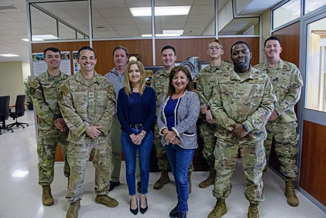 Members of the 496th Air Base Squadron Contracting Flight pose for a group photo at Morón Air Base, Spain, April 12, 2024. The flight includes three Spanish local nationals, who provide continuity and translations when needed for the U.S. members . (U.S. Air Force photo by Tech. Sgt. Megan M. Beatty)