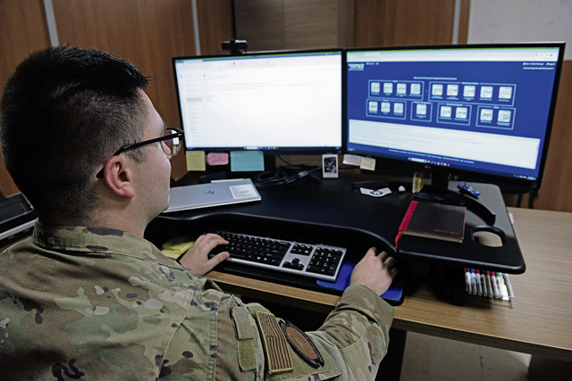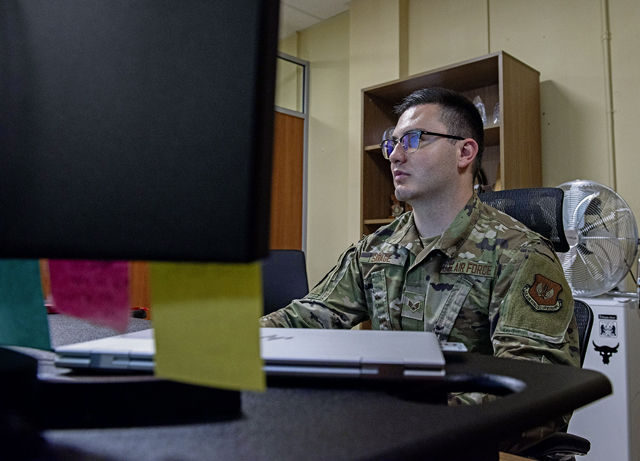 U.S. Air Force Senior Airman Malachi Savage, 496th Air Base Squadron base operations support contracting officer, logs into a contract management system at Morón Air Base, Spain, April 12, 2024. The flight provides support for approximately 300 contractors on base and multiple projects to enhance the readiness and quality of life for 496th ABS members. (U.S. Air Force photo by Tech. Sgt. Megan M. Beatty)