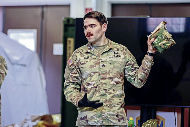 U.S. Army Sgt. Spencer Kasper, chemical, biological, radiological, and nuclear specialist, 7th Mission Support Command, holds up equipment while teaching a class to Soldiers from the 773rd Civil Support Team and 512th Field Hospital on Panzer Kaserne, Kaiserslautern, Germany, on Jan. 22, 2025. The class was held to develop and improve proficiency in responding to a chemical agent and manage or mitigate medical consequences. (U.S. Army photo by Spc. Samuel Signor)