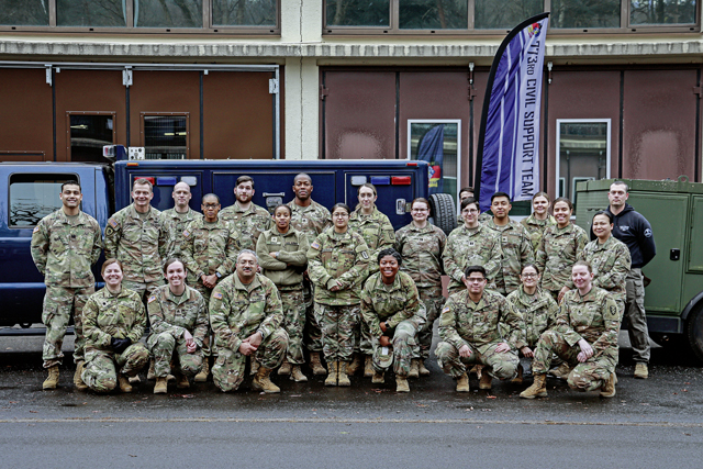 U.S. Army Soldiers from the 773rd Civil Support Team and 512th Field Hospital pose for a photo after concluding decontamination training on Panzer Kaserne, Kaiserslautern, Germany, on Jan. 22, 2025. The class was held to develop and improve proficiency in responding to a chemical agent and manage or mitigate medical consequences. (U.S. Army photo by Spc. Samuel Signor)