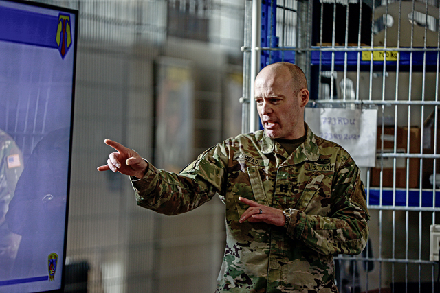 U.S. Army Capt. Jeremiah Head, survey team leader, 7th Mission Support Command, teaches a class to Soldiers from the 773rd Civil Support Team and 512th Field Hospital on Panzer Kaserne, Kaiserslautern, Germany, on Jan. 22, 2025. The class was held to develop and improve proficiency in responding to a chemical agent and manage or mitigate medical consequences. (U.S. Army photo by Spc. Samuel Signor)