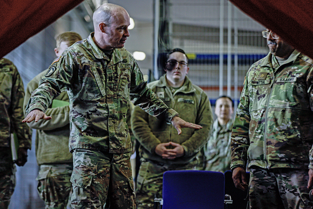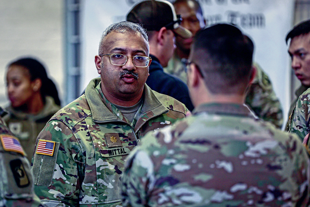 U.S. Army Maj. Sumit Mittal, family medicine physician, 30th Medical Brigade, discusses the class with other Soldiers from the 773rd Civil Support Team and 512th Field Hospital about the decontamination training on Panzer Kaserne, Kaiserslautern, Germany, on Jan. 22, 2025. The class was held to develop and improve proficiency in responding to a chemical agent and manage or mitigate medical consequences. (U.S. Army photo by Spc. Samuel Signor)