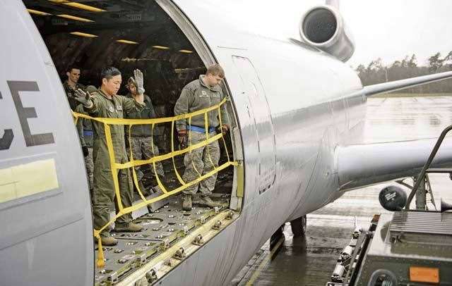The 721st APS, part of the 521st Air Mobility Operations Wing at Ramstein, and the 76th Air Refueling Squadron from McGuire Air Force Base, New Jersey, unloaded the KC-10 Extender and helped coordinate the movement onto another cargo aircraft heading to its final location.