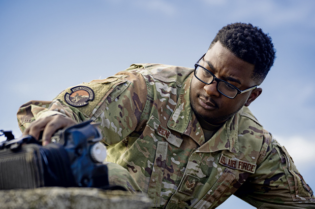 U.S. Air Force Senior Airman Rictaveon Greene, 86th Maintenance Squadron Fabrication Flight non-destructive inspection journeyman, inspects part of the Barrier Arresting Kit-12 during the overhaul of the system at Ramstein Air Base, Germany, Sept. 20, 2022. The BAK-12 is an important system that allows Ramstein to host aircraft from other bases if necessary. (U.S. Air Force photo by Staff Sgt. Jacob Wongwai)