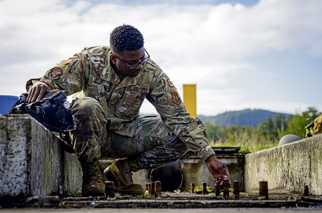 U.S. Air Force Senior Airman Rictaveon Greene, 86th Maintenance Squadron Fabrication Flight non-destructive inspection journeyman, inspects part of the Barrier Arresting Kit-12 during the system overhaul at Ramstein Air Base, Germany, Sept. 20, 2022. The necessary overhaul consisted of replacing four BAK-12 systems, two at each end of both runways. The BAK-12 ensures any aircraft equipped with a tailhook comes to a complete stop if a pilot is unable to land the aircraft safely on their own. (U.S. Air Force photo by Staff Sgt. Jacob Wongwai)