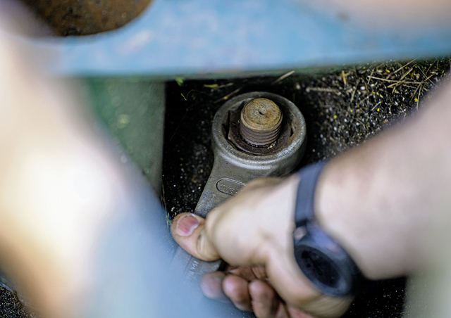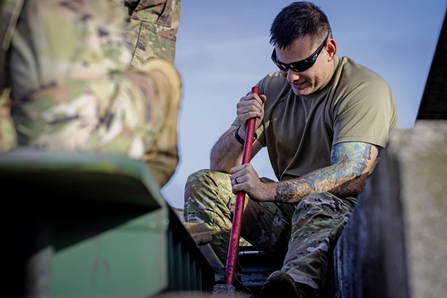 U.S. Air Force Staff Sgt. Jacob Smith, 786th Civil Engineer Squadron power production supervisor, loosens a bolt of the old Barrier Arresting Kit-12 during the system overhaul at Ramstein Air Base, Germany, Sept. 20, 2022. The BAK-12 system allows Ramstein to safely host aircraft with tail hooks in case they are not able to land at their host base. (U.S. Air Force photo by Staff Sgt. Jacob Wongwai)