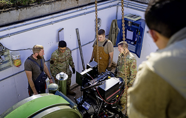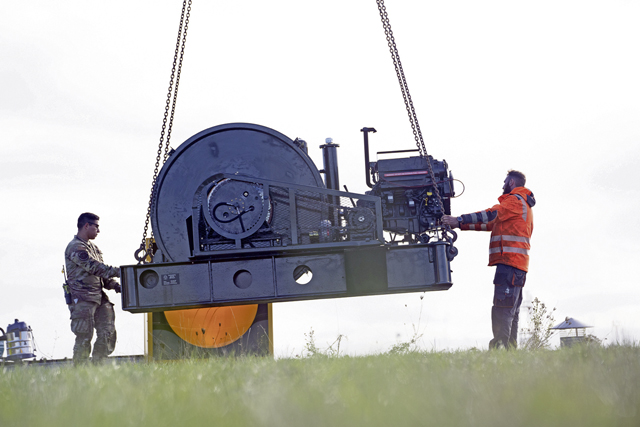Members from the 786th Civil Engineer Squadron install a component for the overhaul of the Barrier Arresting Kit-12 at Ramstein Air Base, Germany, Sept. 20, 2022. The BAK-12 ensures fighter aircraft, or any aircraft equipped with a tailhook, come to a complete stop if a pilot is unable to land the aircraft safely on their own. (U.S. Air Force photo by Staff Sgt. Jacob Wongwai)